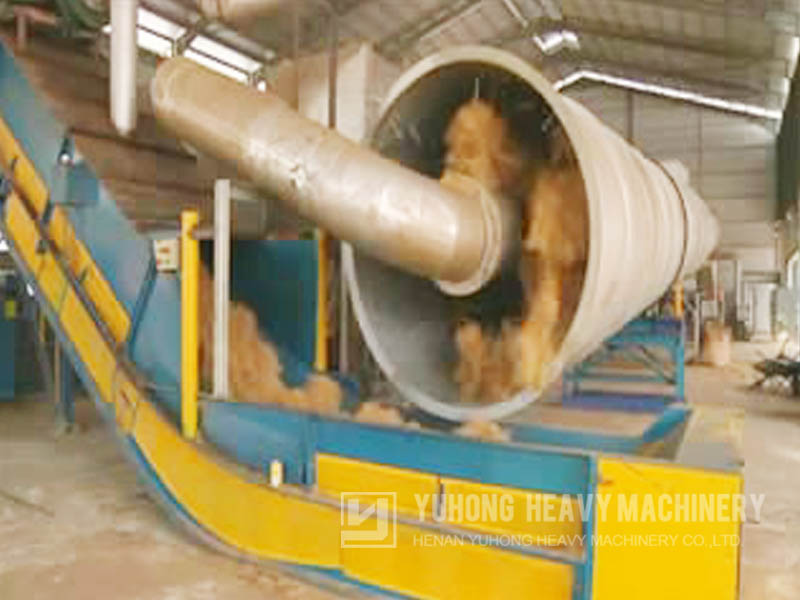 棕榈丝烘干机(棕榈丝烘干设备,棕榈丝烘干生产线)主要包括生热炉、进料口、旋转筒、过滤筒、物料输送管、冷却筒和出料口,旋转筒位于主动滚轮上,主动滚轮靠电机及减速传动带动旋转筒低速转动,生热炉与旋转筒之间设有进料口,旋转筒内设有翻炒叶片,在旋转筒与过滤筒相连处设有挡板,挡板上开有一小孔,过滤筒一端与旋转筒相连,另一端与物料输送管相连,过滤筒内设有挡块,过滤筒的底部设有排渣孔,冷却筒一端通过鼓风机与物料输送管相连,另一端与出料口相连。